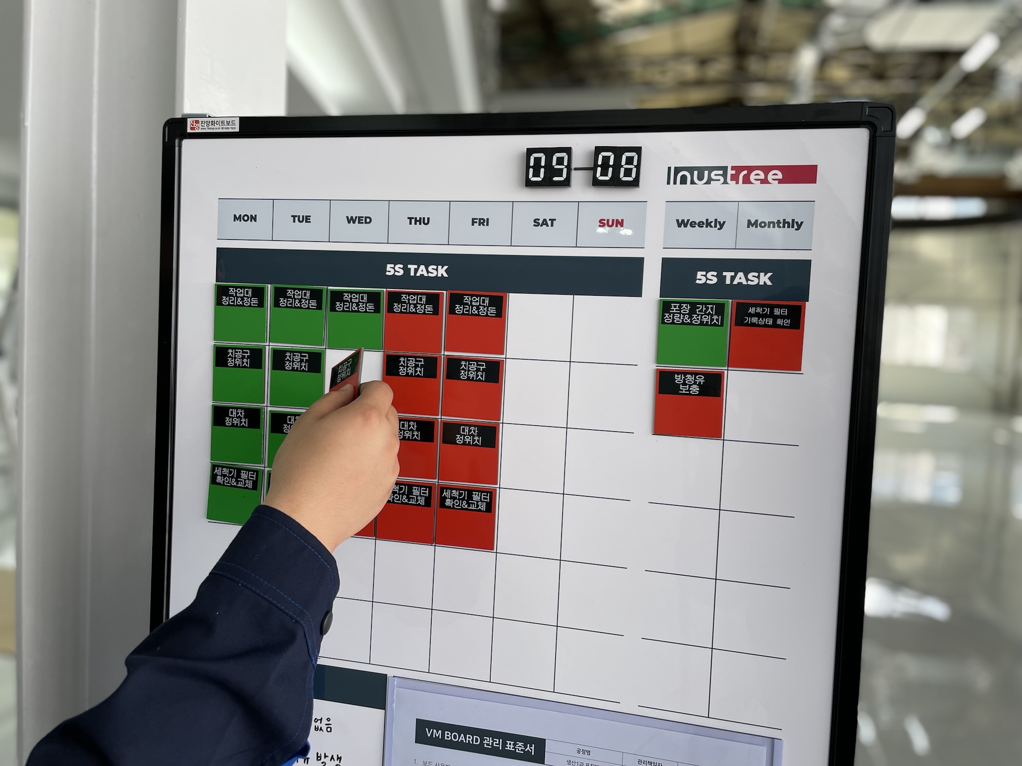 아래 예시는 3정5S 게시판을 활용해 현장을 관리한 사례로, 색상별로 정리·정돈·청소 상태를 구분해 표시한 모습입니다. 담당자는 색상 변화만 보더라도 현장의 유지·관리 상태를 즉시 확인할 수 있어 보다 효율적이고 표준화된 운영이 가능합니다.
