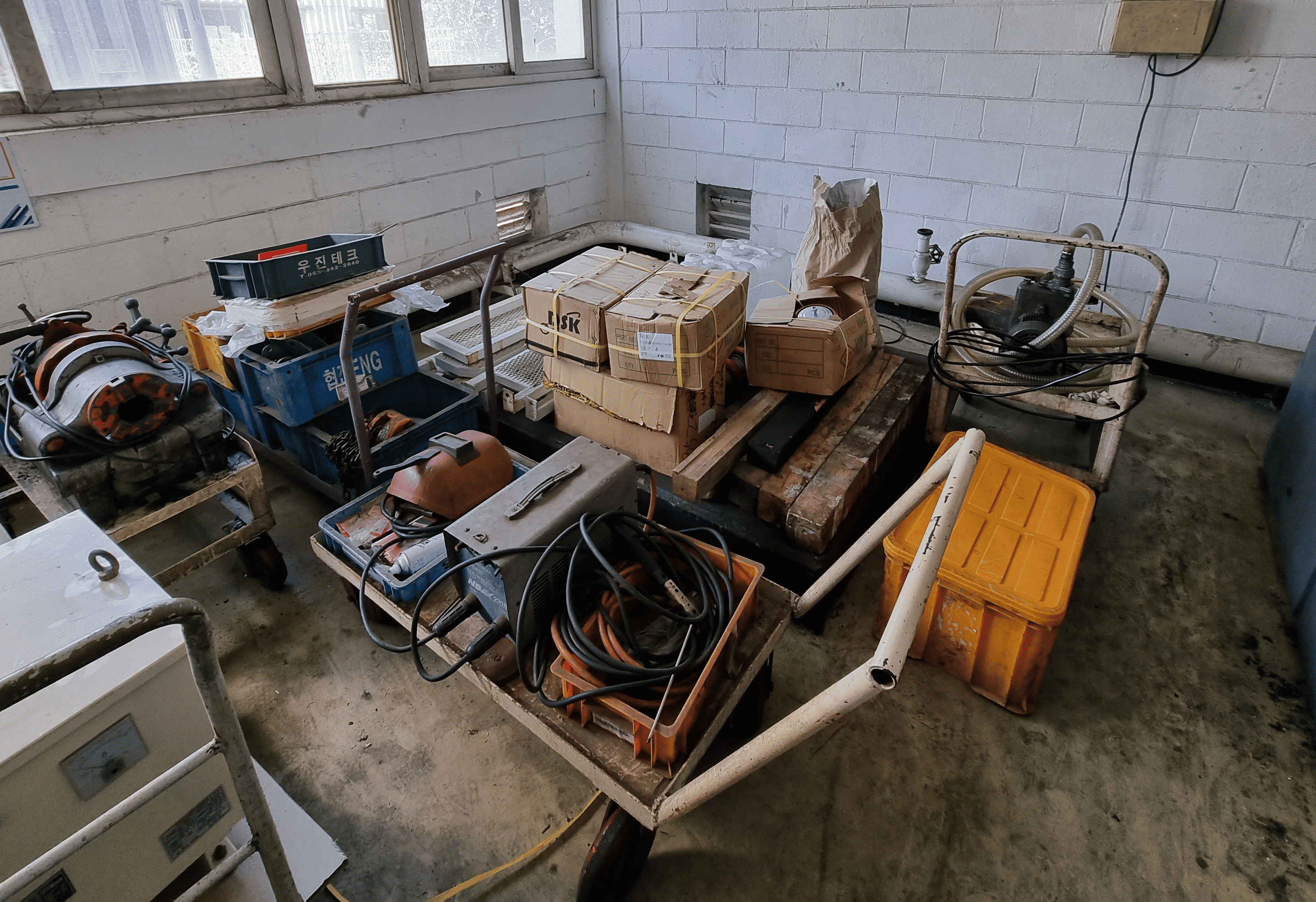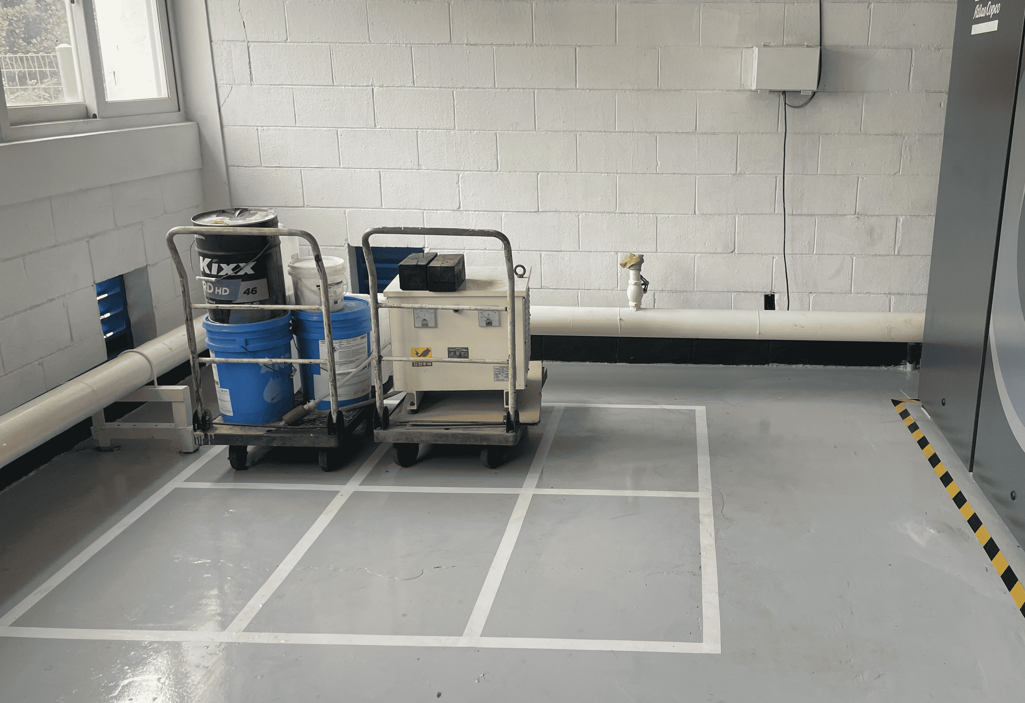 생산 현장에서는 선을 통해 안전 통로, 작업 목표 지점, 완성품 및 대차 보관 구역 등을 명확히 구분하여 작업자의 이동 동선과 작업 효율을 향상시킵니다. 아래 사례는 콤프레샤실 바닥에 정위치 기준선을 적용하기 전과 후를 비교한 것으로, 선 표시만으로도 현장의 질서와 관리수준이 크게 개선되는 모습을 보여줍니다.