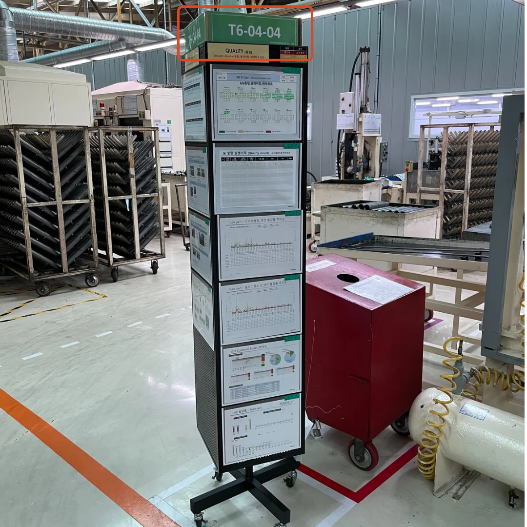 아래 예시는 4면 회전 게시판을 활용한 운영 사례로, 공정별 관리 현황, 생산 현황, KPI 등을 면별로 구분해 배치한 모습입니다. 상단에 배치한 번호를 통해 담당자를 파악할 수 있으며 각 면에 표시된 관리번호를 기준으로 공정 상태를 빠르게 확인하고 필요한 조치를 신속하게 수행할 수 있어 생산 관리의 효율성을 크게 높일 수 있습니다.