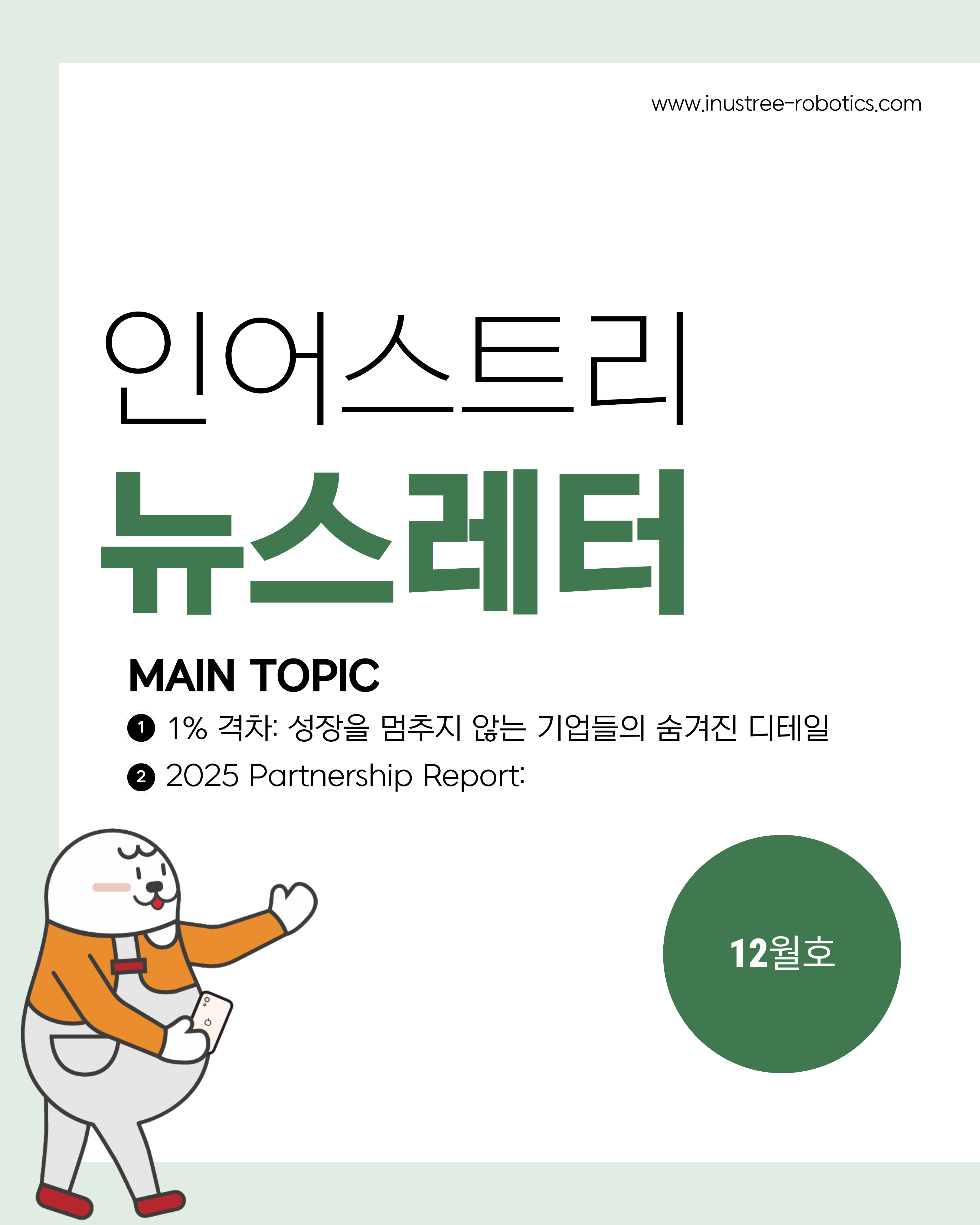 올 한 해 동안 저희 인어스트리는 현장의 안전과 효율을 고민하며 쉼 없이 달려온 시간이었습니다. 특히 새로운 도전이었던 로보틱스 사업을 본격적으로 도입하며, 많은 시행착오 속에서도 값진 배움과 의미 있는 성과를 만들어갈 수 있었습니다. 이 모든 과정은 언제나 저희를 믿고 함께해 주신 여러분 덕분입니다. 진심으로 감사드립니다.